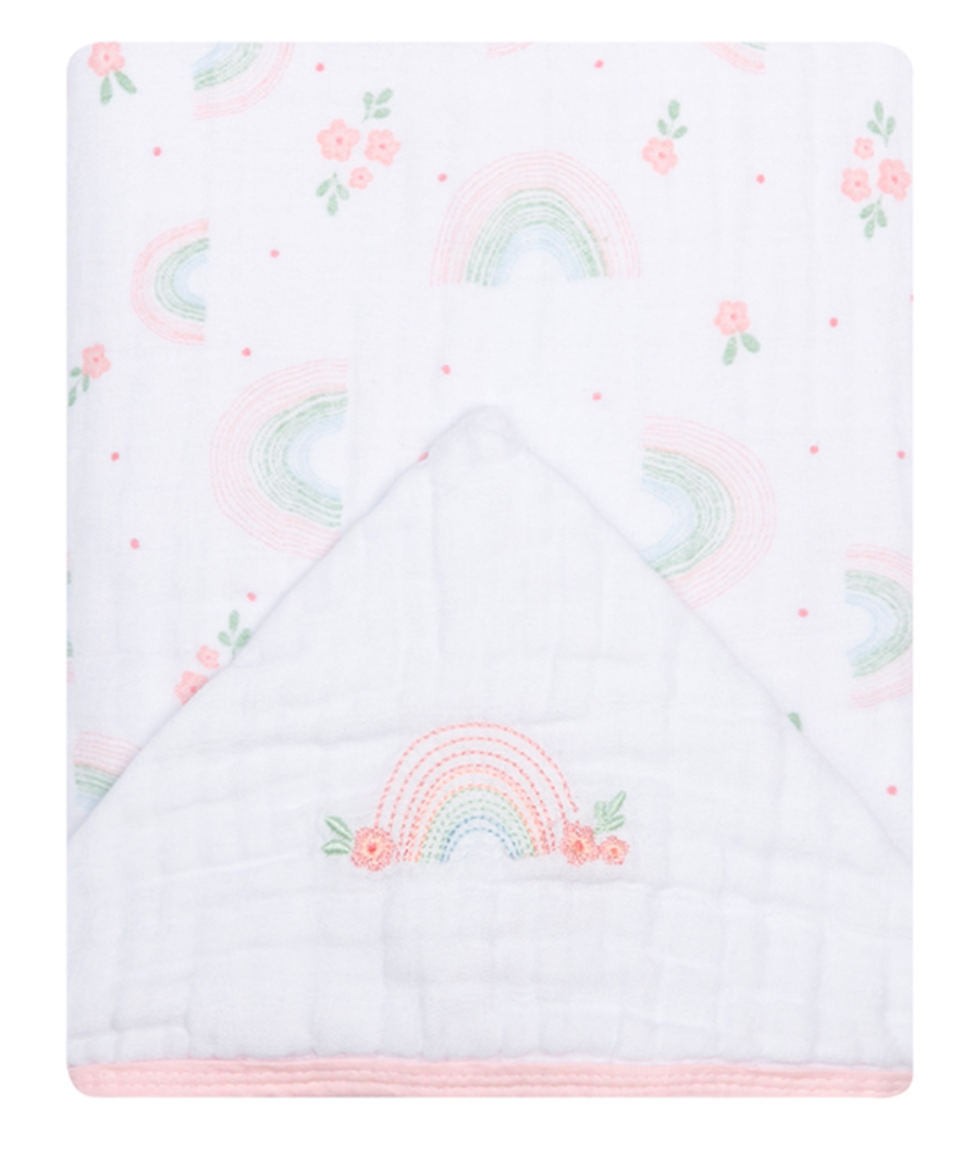 Com tamanho de 90×80 cm, a toalha conta com capuz central que ajuda a proteger e aquecer a cabeça do bebê. A estampa encantadora de arco íris traz um charme especial ao produto, criando um visual acolhedor e delicado para o enxoval.